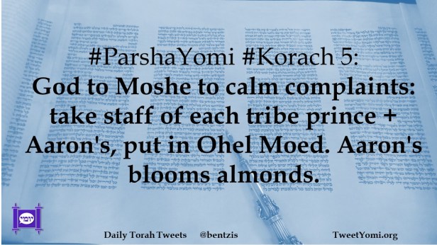 #ParshaYomi #Korach 5: God to Moshe to calm complaints: take staff of each tribe prince + Aaron’s, put in Ohel Moed. Aaron’s blooms almonds.