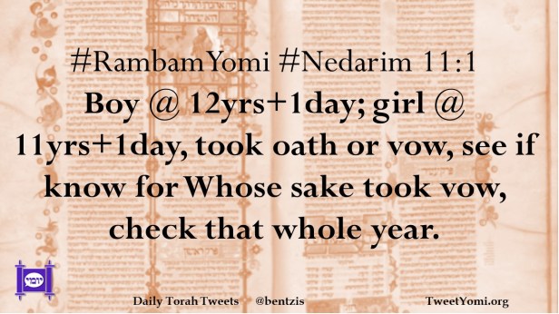 #RambamYomi #Nedarim 11:1 Boy @ 12yrs+1day; girl @ 11yrs+1day, took oath or vow, see if know for Whose sake took vow, check that whole year.