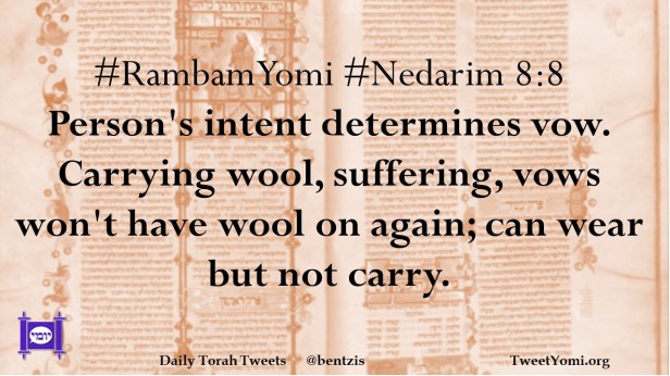 #RambamYomi #Nedarim 8:8 Person’s intent determines vow. Carrying wool, suffering, vows won’t have wool on again; can wear but not carry.