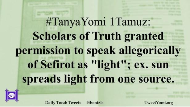 #TanyaYomi 1Tamuz: Scholars of Truth granted permission to speak allegorically of Sefirot as “light”; ex. sun spreads light from one source.