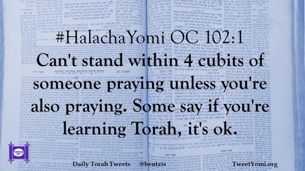 #HalachaYomi OC 102:1 Can’t stand within 4 cubits of someone praying unless you’re also praying. Some say if you’re learning Torah, it’s ok.