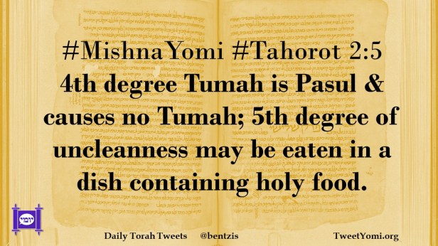 #MishnaYomi #Tahorot 2:5 4th degree Tumah is Pasul & causes no Tumah; 5th degree of uncleanness may be eaten in a dish containing holy food.