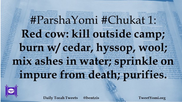 #ParshaYomi #Chukat 1: Red cow: kill outside camp; burn w/ cedar, hyssop, wool; mix ashes in water; sprinkle on impure from death; purifies.