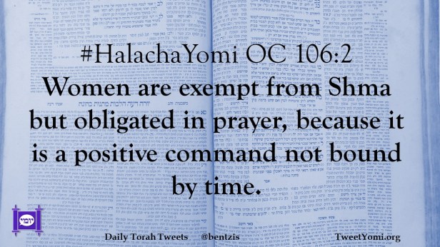 #HalachaYomi OC 106:2 Women are exempt from Shma but obligated in prayer, because it is a positive command not bound by time.
