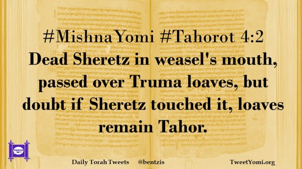 #MishnaYomi #Tahorot 4:2 Dead Sheretz in weasel’s mouth, passed over Truma loaves, but doubt if Sheretz touched it, loaves remain Tahor.