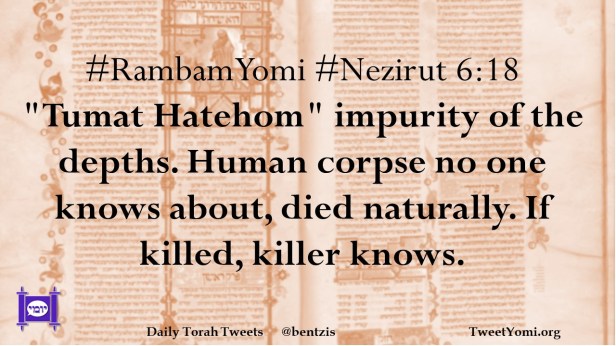 #RambamYomi #Nezirut 6:18 “Tumat Hatehom” impurity of the depths. Human corpse no one knows about, died naturally. If killed, killer knows.