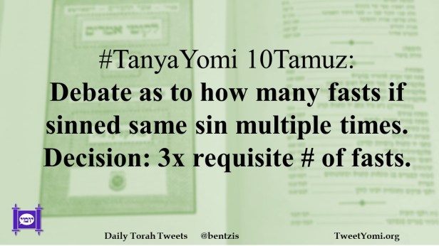 TanyaYomi #TanyaYomi 10Tamuz Date: August 6, 2021Author: ysspitz #TanyaYomi 10Tamuz: Debate as to how many fasts if sinned same sin multiple times. Decision: 3x requisite # of fasts. Share this: Share on X (Opens in new window) X Share on Facebook (Opens in new window) Facebook Like Loading... Related