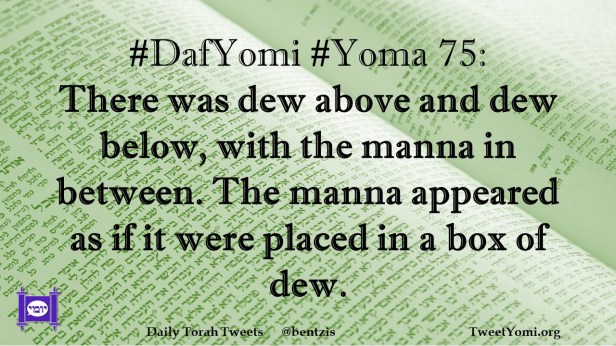 DafYomi, Yoma #DafYomi #Yoma 75 Date: August 10, 2021Author: ysspitz #DafYomi #Yoma 75: There was dew above and dew below, with the manna in between. The manna appeared as if it were placed in a box of dew. Share this: Share on X (Opens in new window) X Share on Facebook (Opens in new window) Facebook Like Loading... Related