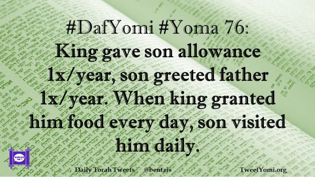 DafYomi, Yoma #DafYomi #Yoma 76 Date: August 10, 2021Author: ysspitz #DafYomi #Yoma 76: King gave son allowance 1x/year, son greeted father 1x/year. When king granted him food every day, son visited him daily. Share this: Share on X (Opens in new window) X Share on Facebook (Opens in new window) Facebook Like Loading... Related