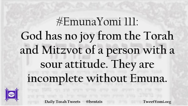 #EmunaYomi 111: God has no joy from the Torah and Mitzvot of a person with a sour attitude. They are incomplete without Emuna.