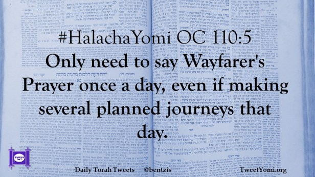 HalachaYomi #HalachaYomi OC 110:5 Date: August 10, 2021Author: ysspitz #HalachaYomi OC 110:5 Only need to say Wayfarer’s Prayer once a day, even if making several planned journeys that day. Share this: Share on X (Opens in new window) X Share on Facebook (Opens in new window) Facebook Like Loading... Related