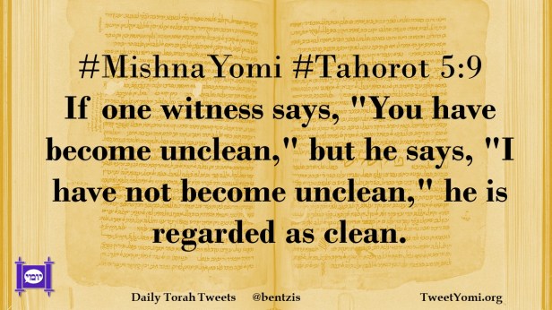 #MishnaYomi #Tahorot 5:9 If one witness says, “You have become unclean,” but he says, “I have not become unclean,” he is regarded as clean.