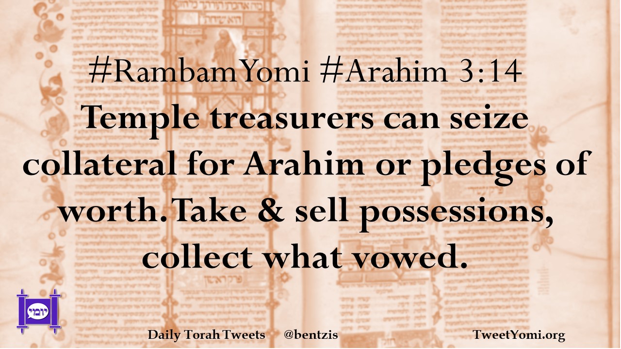 #RambamYomi #Arahim 3:14 Temple treasurers can seize collateral for Arahim or pledges of worth. Take & sell possessions, collect what vowed.