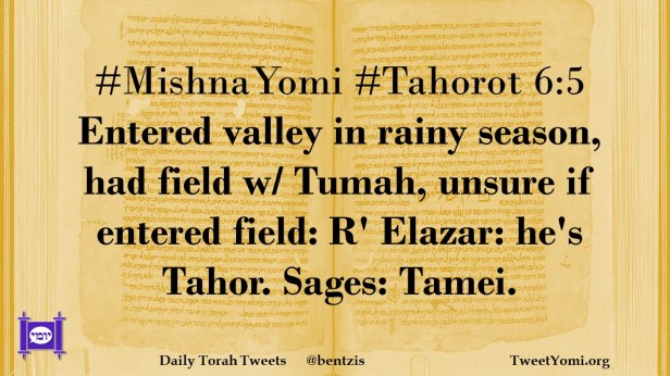 #MishnaYomi #Tahorot 6:5 Entered valley in rainy season, had field w/ Tumah, unsure if entered field: R’ Elazar: he’s Tahor. Sages: Tamei.