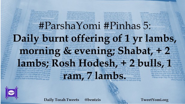 #ParshaYomi #Pinhas 5: Daily burnt offering of 1 yr lambs, morning & evening; Shabat, + 2 lambs; Rosh Hodesh, + 2 bulls, 1 ram, 7 lambs.