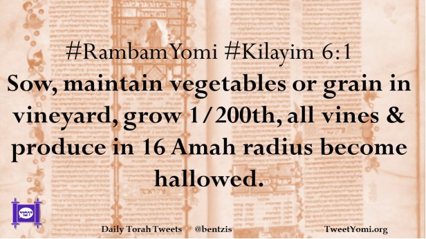 #RambamYomi #Kilayim 6:1 Sow, maintain vegetables or grain in vineyard, grow 1/200th, all vines & produce in 16 Amah radius become hallowed.