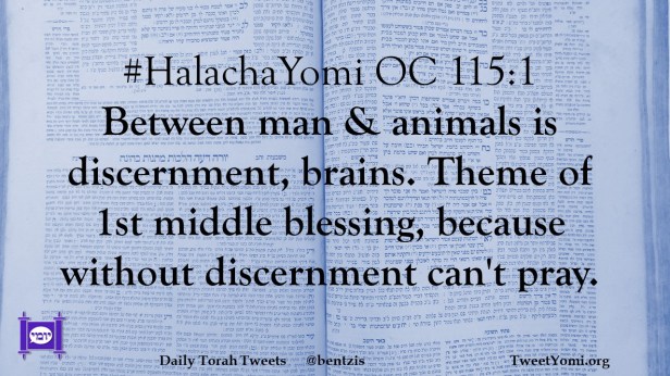 #HalachaYomi OC 115:1 Between man & animals is discernment, brains. Theme of 1st middle blessing, because without discernment can’t pray.