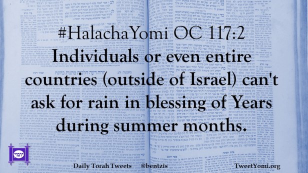 #HalachaYomi OC 117:2 Individuals or even entire countries (outside of Israel) can’t ask for rain in blessing of Years during summer months.