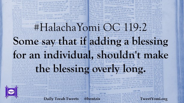 HalachaYomi #HalachaYomi OC 119:2 Date: August 13, 2021Author: ysspitz #HalachaYomi OC 119:2 Some say that if adding a blessing for an individual, shouldn’t make the blessing overly long. Share this: Share on X (Opens in new window) X Share on Facebook (Opens in new window) Facebook Like Loading... Related