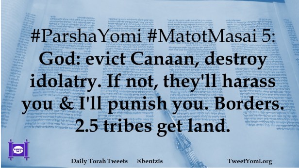 #ParshaYomi #MatotMasai 5: God: evict Canaan, destroy idolatry. If not, they’ll harass you & I’ll punish you. Borders. 2.5 tribes get land.