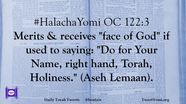 #HalachaYomi OC 122:3 Merits & receives “face of God” if used to saying: “Do for Your Name, right hand, Torah, Holiness.” (Aseh Lemaan).