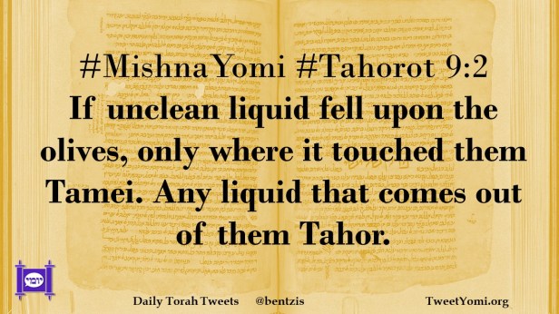 #MishnaYomi #Tahorot 9:2 If unclean liquid fell upon the olives, only where it touched them Tamei. Any liquid that comes out of them Tahor.
