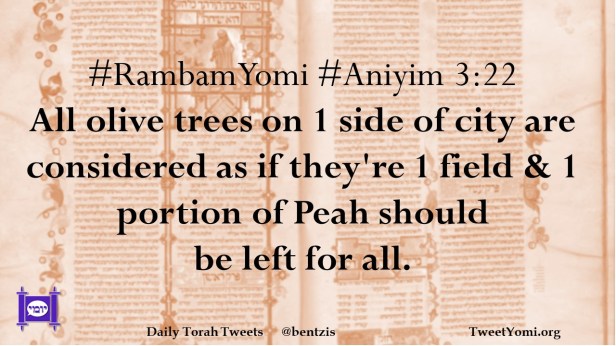 #RambamYomi #Aniyim 3:22 All olive trees on 1 side of city are considered as if they’re 1 field & 1 portion of Peah should be left for all.