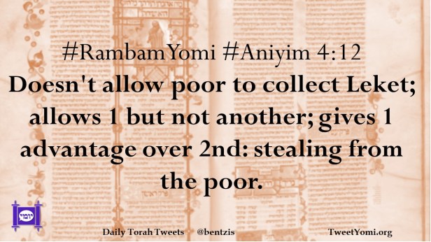 #RambamYomi #Aniyim 4:12 Doesn’t allow poor to collect Leket; allows 1 but not another; gives 1 advantage over 2nd: stealing from the poor.