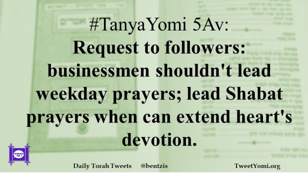 #TanyaYomi 5Av: Request to followers: businessmen shouldn’t lead weekday prayers; lead Shabat prayers when can extend heart’s devotion.