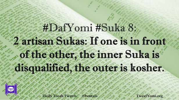 DafYomi, Suka #DafYomi #Suka 8 Date: August 16, 2021Author: ysspitz #DafYomi #Suka 8: 2 artisan Sukas: If one is in front of the other, the inner Suka is disqualified, the outer is kosher. Share this: Share on X (Opens in new window) X Share on Facebook (Opens in new window) Facebook Like Loading... Related