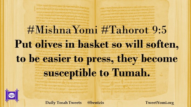 MishnaYomi, Tahorot #MishnaYomi #Tahorot 9:5 Date: August 16, 2021Author: ysspitz #MishnaYomi #Tahorot 9:5 Put olives in basket so will soften, to be easier to press, they become susceptible to Tumah. Share this: Share on X (Opens in new window) X Share on Facebook (Opens in new window) Facebook Like Loading... Related
