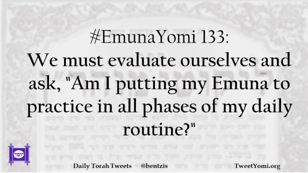 EmunaYomi #EmunaYomi 133 Date: August 17, 2021Author: ysspitz #EmunaYomi 133: We must evaluate ourselves and ask, “Am I putting my Emuna to practice in all phases of my daily routine?” Share this: Share on X (Opens in new window) X Share on Facebook (Opens in new window) Facebook Like Loading... Related