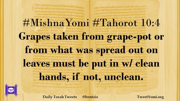 #MishnaYomi #Tahorot 10:4 Grapes taken from grape-pot or from what was spread out on leaves must be put in w/ clean hands, if not, unclean.