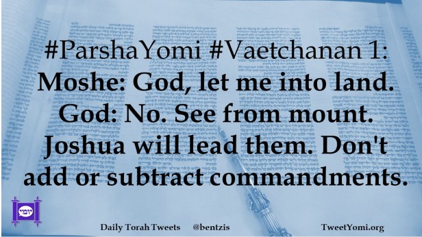#ParshaYomi #Vaetchanan 1: Moshe: God, let me into land. God: No. See from mount. Joshua will lead them. Don’t add or subtract commandments.
