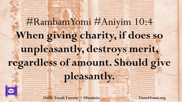 #RambamYomi #Aniyim 10:4 When giving charity, if does so unpleasantly, destroys merit, regardless of amount. Should give pleasantly.