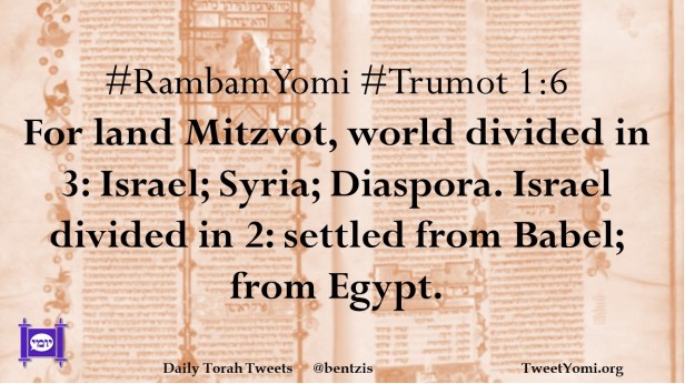 #RambamYomi #Trumot 1:6 For land Mitzvot, world divided in 3: Israel; Syria; Diaspora. Israel divided in 2: settled from Babel; from Egypt.