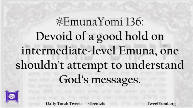 EmunaYomi #EmunaYomi 136 Date: August 18, 2021Author: ysspitz #EmunaYomi 136: Devoid of a good hold on intermediate-level Emuna, one shouldn’t attempt to understand God’s messages. Share this: Share on X (Opens in new window) X Share on Facebook (Opens in new window) Facebook Like Loading... Related