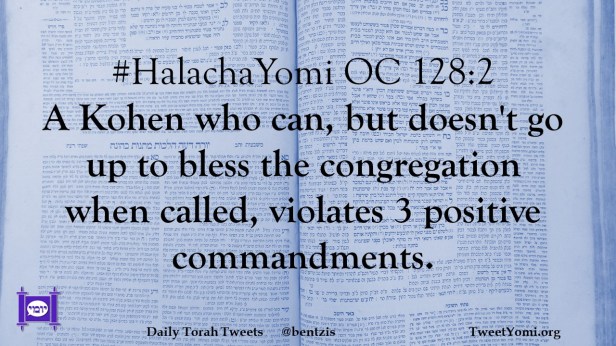 #HalachaYomi OC 128:2 A Kohen who can, but doesn’t go up to bless the congregation when called, violates 3 positive commandments.