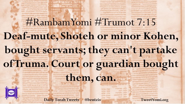 #RambamYomi #Trumot 7:15 Deaf-mute, Shoteh or minor Kohen, bought servants; they can’t partake of Truma. Court or guardian bought them, can.