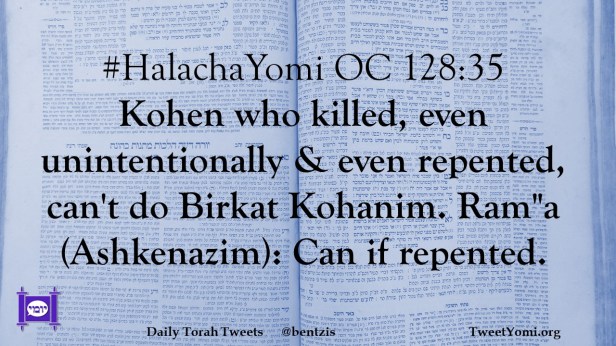 #HalachaYomi OC 128:35 Kohen who killed, even unintentionally & even repented, can’t do Birkat Kohanim. Ram”a (Ashkenazim): Can if repented.