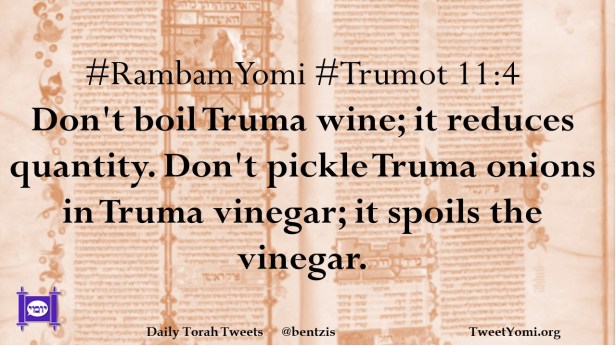 #RambamYomi #Trumot 11:4 Don’t boil Truma wine; it reduces quantity. Don’t pickle Truma onions in Truma vinegar; it spoils the vinegar.