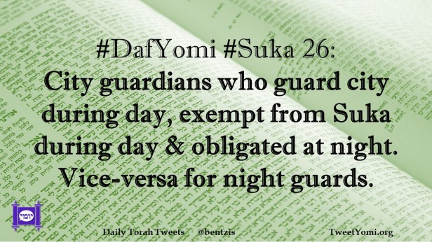 DafYomi, Suka #DafYomi #Suka 26 Date: August 22, 2021Author: ysspitz #DafYomi #Suka 26: City guardians who guard city during day, exempt from Suka during day & obligated at night. Vice-versa for night guards. Share this: Share on X (Opens in new window) X Share on Facebook (Opens in new window) Facebook Like Loading... Related