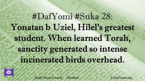 DafYomi, Suka #DafYomi #Suka 28 Date: August 22, 2021Author: ysspitz #DafYomi #Suka 28: Yonatan b Uziel, Hilel’s greatest student. When learned Torah, sanctity generated so intense incinerated birds overhead. Share this: Share on X (Opens in new window) X Share on Facebook (Opens in new window) Facebook Like Loading... Related