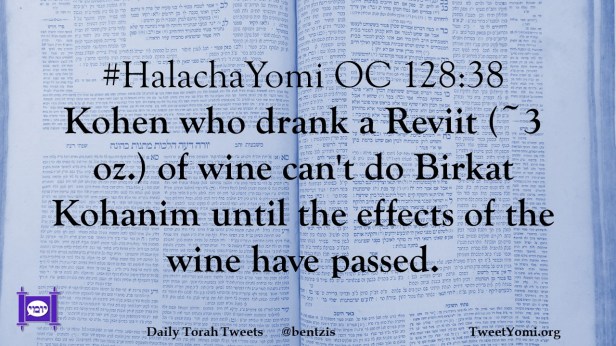 #HalachaYomi OC 128:38 Kohen who drank a Reviit (~3 oz.) of wine can’t do Birkat Kohanim until the effects of the wine have passed.