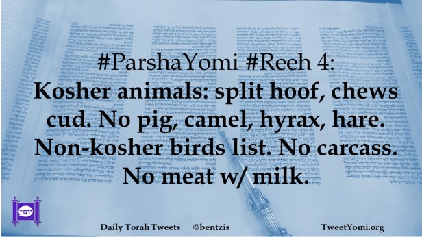 #ParshaYomi #Reeh 4: Kosher animals: split hoof, chews cud. No pig, camel, hyrax, hare. Non-kosher birds list. No carcass. No meat w/ milk.