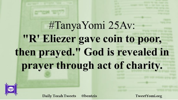 TanyaYomi #TanyaYomi 25Av Date: August 22, 2021Author: ysspitz #TanyaYomi 25Av: “R’ Eliezer gave coin to poor, then prayed.” God is revealed in prayer through act of charity. Share this: Share on X (Opens in new window) X Share on Facebook (Opens in new window) Facebook Like Loading... Related