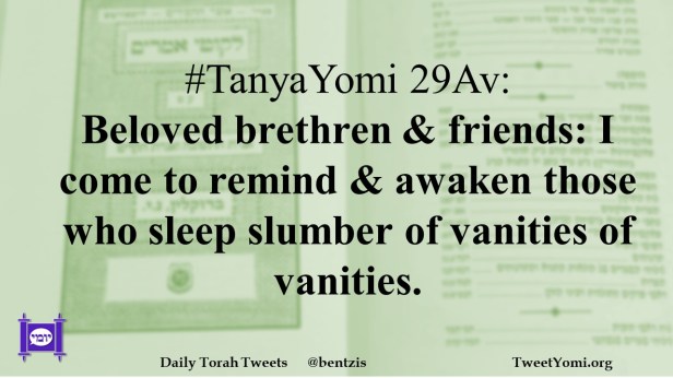 TanyaYomi #TanyaYomi 29Av Date: August 23, 2021Author: ysspitz #TanyaYomi 29Av: Beloved brethren & friends: I come to remind & awaken those who sleep slumber of vanities of vanities. Share this: Share on X (Opens in new window) X Share on Facebook (Opens in new window) Facebook Like Loading... Related
