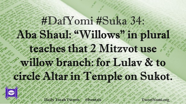 DafYomi, Suka #DafYomi #Suka 34 Date: August 25, 2021Author: ysspitz #DafYomi #Suka 34: Aba Shaul: “Willows” in plural teaches that 2 Mitzvot use willow branch: for Lulav & to circle Altar in Temple on Sukot. Share this: Share on X (Opens in new window) X Share on Facebook (Opens in new window) Facebook Like Loading... Related