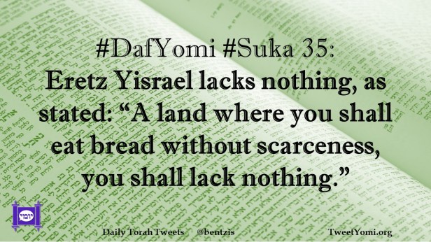 DafYomi, Suka #DafYomi #Suka 35 Date: August 25, 2021Author: ysspitz #DafYomi #Suka 35: Eretz Yisrael lacks nothing, as stated: “A land where you shall eat bread without scarceness, you shall lack nothing.” Share this: Share on X (Opens in new window) X Share on Facebook (Opens in new window) Facebook Like Loading... Related