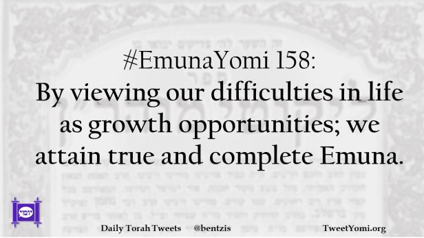 EmunaYomi #EmunaYomi 158 Date: August 25, 2021Author: ysspitz #EmunaYomi 158: By viewing our difficulties in life as growth opportunities; we attain true and complete Emuna. Share this: Share on X (Opens in new window) X Share on Facebook (Opens in new window) Facebook Like Loading... Related